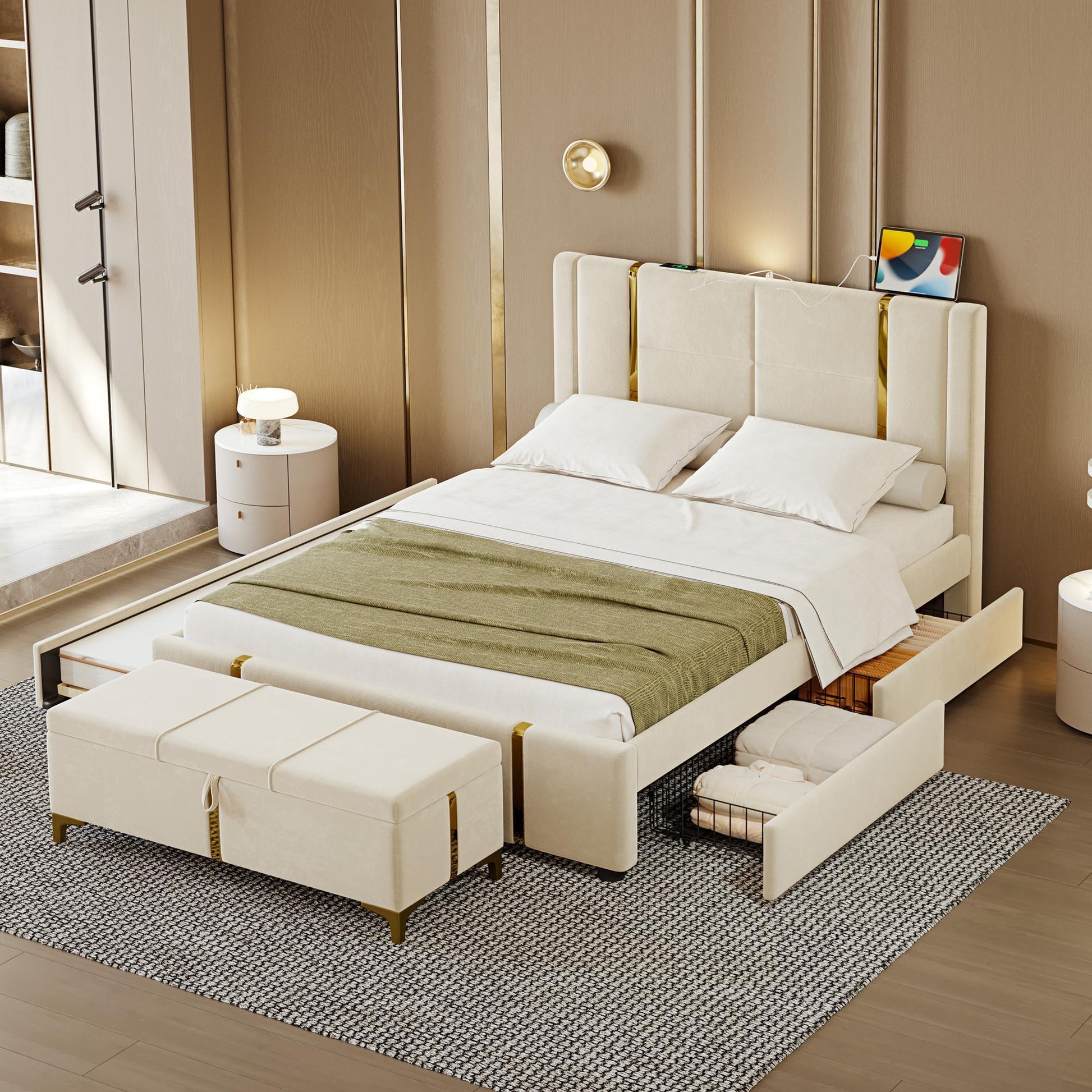 2-Pieces Bedroom Sets,Queen Size Upholstered Platform Bed with Trundle Bed, 2 Drawers,Night Light and USB Charge,Storage Ottoman with Metal Legs,Beige