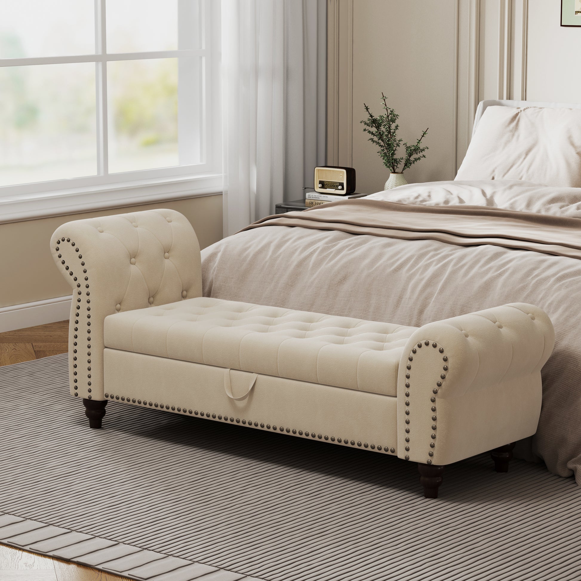 64.5' Bed Bench for Bed Room Nails Tufted Chaise of Lounge with Storage Velvet Upholstery Beige